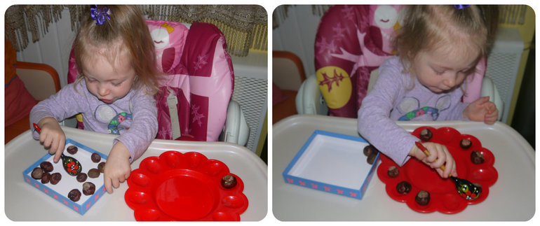 3. Перекладывание каштанов с помощью ложки в ячейки.
