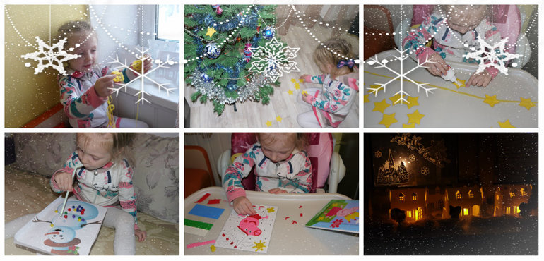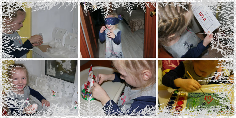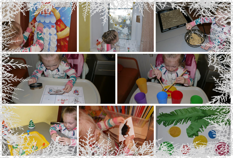 Аппликации (использовали альбом для творчества) - делали кормушку для синичек, насыпали корма, рисовали узоры на окнах, заплатки, собирали пазлы.