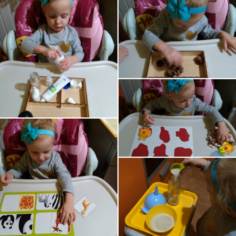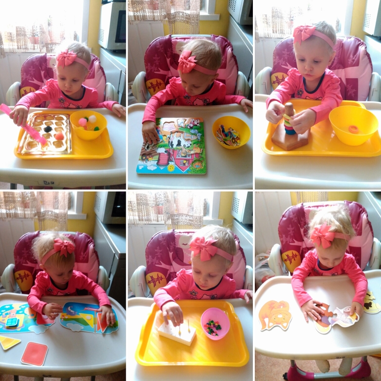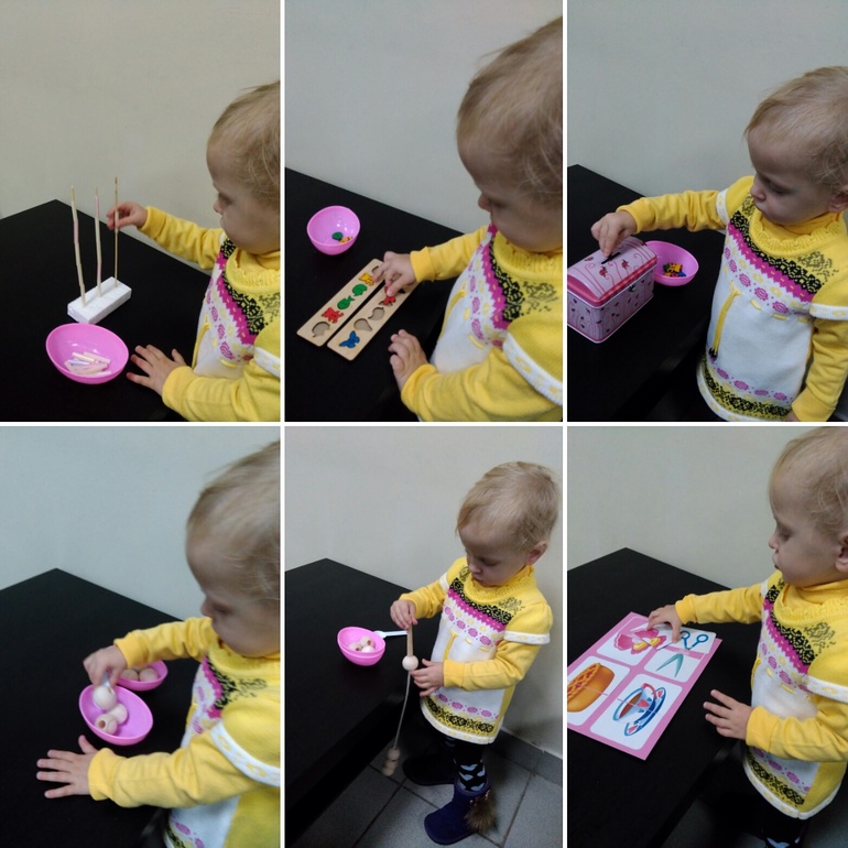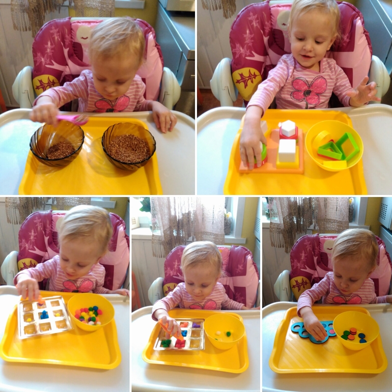 2) раскладывала пуговицы в рамки; 3)складывала пуговицы в прорезь в копилку; 4)перекладывала бусины ложкой;