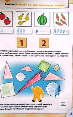 Второе также на счет . Необходимо было посчитать предметы на картинках и закрасить кружки внизу. А дальше изучение геометрических фигур. Раскрасить в указанные цвета определенные фигуры, например круг в синий. посчитать чего больше. Брала материалы отсюда.