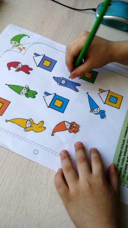 Необходимо было посчитать гномиков и дома, сказать чего больше. Дорисовать недостающие домики и расселить гномов по домам. Раскрасить крыши в соответствующие цвета.