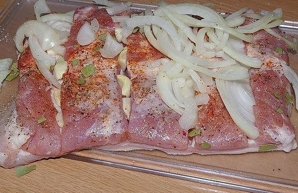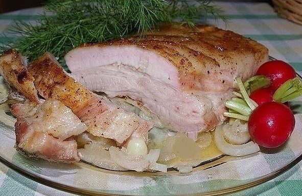 РецептыИнгредиенты 1,5 кг грудинки; 4 шт лука репчатого; 1 головка чеснока; соль, перец, лавровый лист; 1/2 стакана газированной воды. Приготовление: Шкурка на моих кусочках была тонкая, но следуя советам оригинального рецепта, я ее сняла.Грудинку нарежем крупными ломтями (не до конца).Натираем солью, перцем, добавила для жгучести еще и кайенского. В разрезы вставила крупно порезанный чеснок, помяла полукольца лука и обложила мясо, присыпала измельченным лавровым листом. Мариновалось мясо 6 часов в холодильнике.Завернула в фольгу (см. фото) грудинку, весь лук положила вниз, под мясо, добавила 1/2 стакана сильногазированной воды и отправила в духовку на 1 час 20 минут (190 градусов). Приятного аппетита!