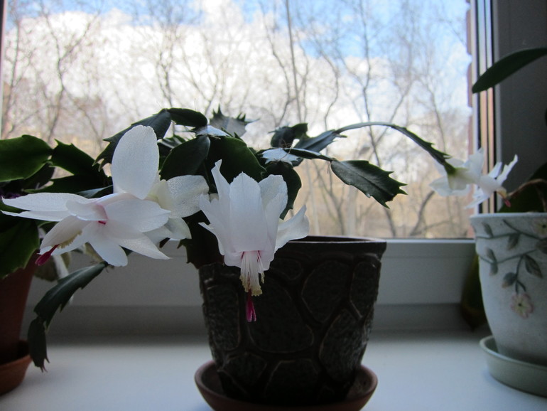 Декабрист, подаренный свекровью. Она каждый раз удивляется, что у нас он цветет (и тоже, мне кажется, уже постоянно). Наверно, орхидея на него так влияет. Они как одурелые соревнуются между собой.
