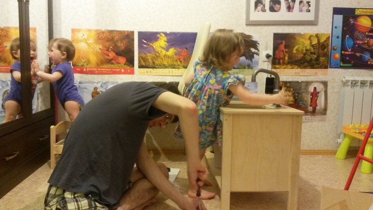 Девчонки активно помогали папе в сборке. Она достаточно компактная оказалась, я почему-то думала, что больше места займет. Лиза была в восторге! Мыла, мыла, готовила, готовила, а на третий день кухня почему-то стала пастбищем для зебр. Бегают, прячутся в шкафчиках, носятся по склонам крана и равнинам плиты.