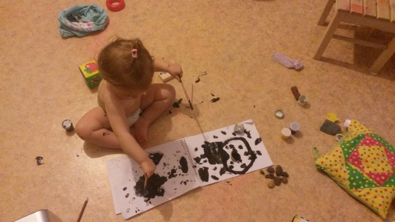 Ест Катя сама и левой рукой. Рисует тоже левой. Зубы чистить даю щетку ей в правую, она чистит правой. А потом перекладывает в левую. Вроде бы в этом возрасте Лиза уже уверенно выбирала правую руку. После чистки зубов Катюша умывается. Это уморительно, как она мочит ладошки, а потом трет мордашку, тщательно зажмуриваясь))) Лиза до сих пор не умывается, только в саду.