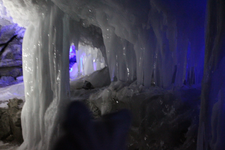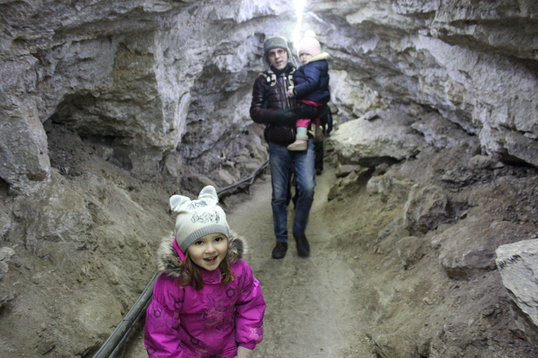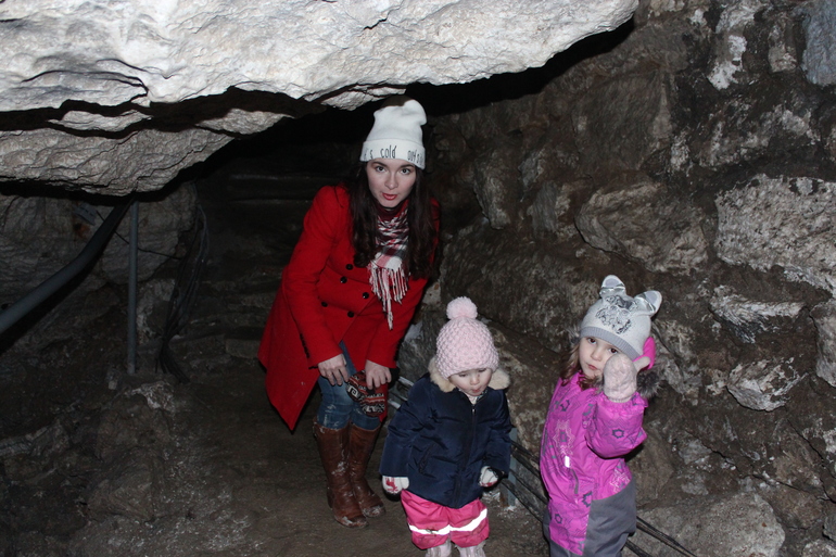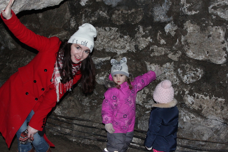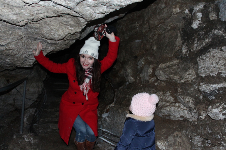 Катя спит на морозе)) Температура была -2. Но промозглый ветер морозил до костей. На фото одна треть очереди!!! Стоять надо около часа в ней! Едут со всей России в эту пещеру и даже иностранцы бывают! Когда я была впервые в ней, то ничего подобного не было. Не было даже туалета цивильного, мы сикали на вокзале))) Была небольшая будка-касса и щель в горе. А теперь это типичный туристический комплекс. Есть гостиница рядом, кафешка, игровые площадки. Но самое ужасное - саму пещеру облагородили! Внутри она вся в неоновых огнях и аккуратных туристических дорожках. Даже с колясками детскими люди заходили туда. Т.е. экстремальный тур на выживание, на проверку фобий и мужества превратили в прогулку детского сада. Говорят, что там есть отдельные тропы для любителей экстрима. Но мы со своими потомками пошли по красочному маршруту обзорной экскурсии.