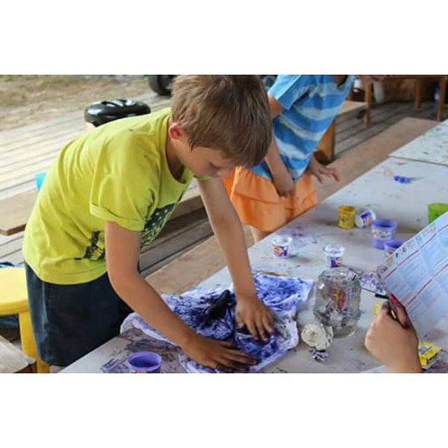 Нашла на станице лагеря сегодняшнее фото сына - теперь я знаю почему у него руки по локоть синие )))) Николь тоже красила футболку, но у нее ни следа .. вчера пекли хлеб, сегодня тема текстиля, завтра будут сажать что-то. Тема проходящего лагеря "- Старые ремесла"... Дети в восторге, приходят по уши грязные ...чего еще и желать? On the farm today - day 2