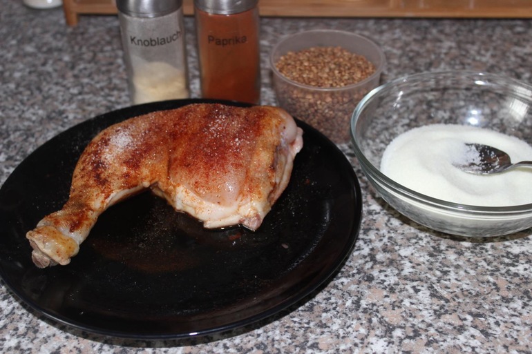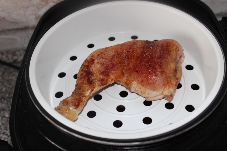 Сверху на паровую чашу укладываем замаринованный окорочок (кожу я снимаю)
