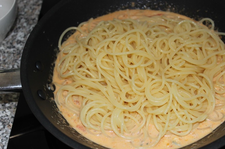 К этому времени готова паста, сливаем воду и смешиваем с нашей подливой