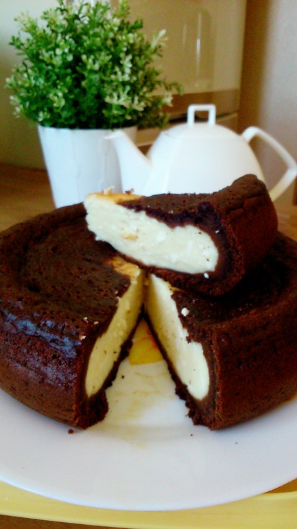 В чашу МВ, предварительно смазанной сливочным маслом наливаем наше шоколадное тесно, на него, очень аккуратно творожную начинку. Выпекать в МВ (у меня Редмонд) 1 час 20 мин.