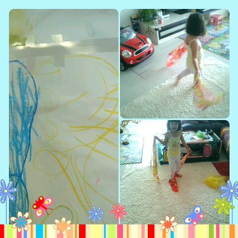 Потанцевали с платочками под музыку Вивальды, времена года. Нам обеим очень понравилось. Но к концу наступили на платок, и упали прям носом на плиточный пол. Поплакали для приличия и больше к платочкам мы не подходим.((((
