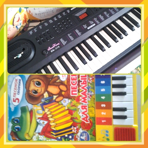 Посидели возле нашего синтезатора. Поиграли до-ре-ми, все семь нот Вика у меня знает. Мы ходим каждую субботу на уроки музыки в нашу школу развития. Там они уже учат песенки по нотам. Хотя результати сильного я не вижу.