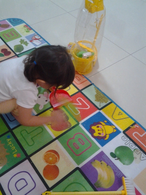 Вставляля фото и вспомнила, потом мы еще подметали пол, убирали кукурузу, конечно больше размазала, но хоть так приучаться к труду )))) Тем более игрушки до сих пор чаще убирает дома мама, чем доча.