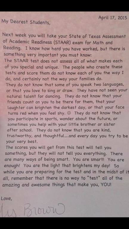 Оценка, которую вы получите за тест, конечно, говорит о чем-то, но не обо всем. Есть много способов быть умницей! А вы умницы! И этого достаточно! Вы делаете мои дни ярче! Поэтому, пока готовитесь к тесту и во время его, помните, что он не покажет все те замечательные черты, которыми обладает каждый из вас, и которые отличают каждого из вас!»