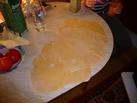 1. Тесто. Просеянную муку насыпать на стол в виде горки, сделать в ней углубление, положить соль и яйца. Замесить тесто. Поставить в теплое место на 20 минут. Разделить на 9 частей. Каждую часть раскатать на тонкие листы. Варить в подсоленной воде 10-15 минут.