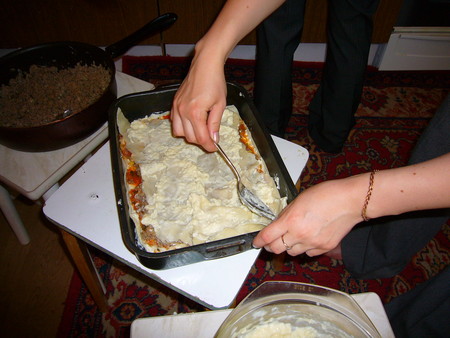 5. На противень нанести тонким слоем соус бешамель, положить лист лазаньи, залить соусом, положить сверху пюре из помидоров и покрыть мясной начинкой, сверху положить натертый сыр, накрыть следующим листом лазаньи и повторить последовательно действия. Верхний слой состоит из соуса бешамель, томатного пюре и специй.