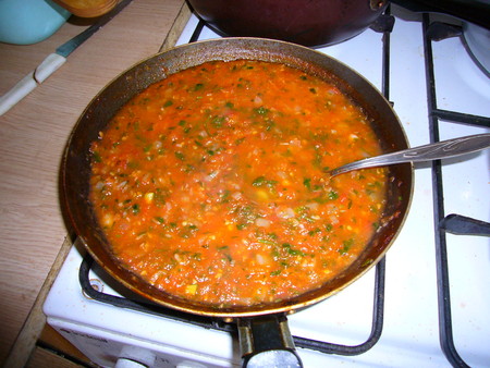 2. Начинка. Мясо пропустить через мясорубку и обжарить с луком (1 луковица) на сковороде, добавить соль, перец, специи и тушить вместе с водой или бульоном до выкипания. Помидоры ошпарить, снять шкурку, растолочь до пюреобразного состояния. Лук (1 луковица) порезать, обжарить, добавить пюре из помидоров, чеснок, петрушку, базелик.