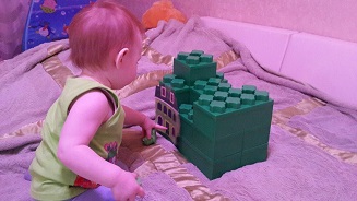Но время шло к обеду и дневному сну, поэтому нужно было успокаиваться и играть в менее подвижные игры. И так как вчера мы на ночь не почитали сказку, мы решили компенсировать это сегодня!) Будем совмещать весёлое с полезным: театрализировать сказку "Теремок" на наш лад!) Для начала мы построили теремок из зелёного конструктора.