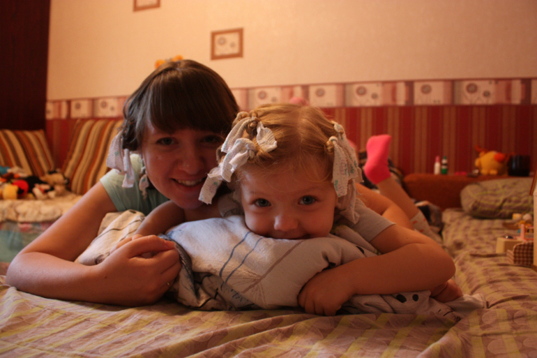 алиса попросила сделать "бантики" на голове) и потом помогла маме тоже себе сделать такие же)