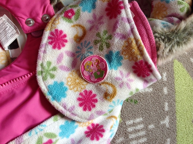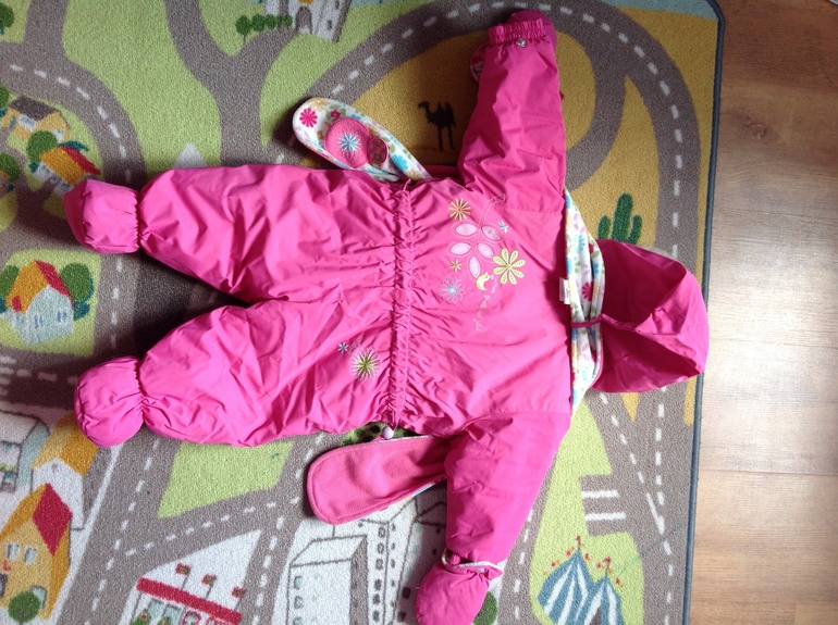 В комплекте с комбинезоном шарф, манишка и флисовая шапочка. Рукавички без пальчиков пристегиваются, пинетки не отстегиваются.