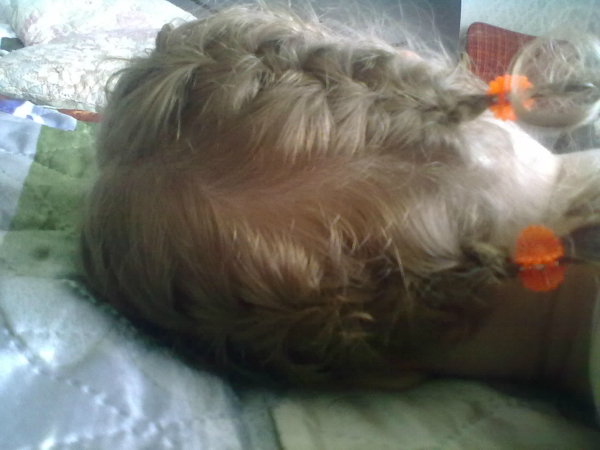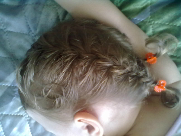 Перед сном, на мокрые волосы дала заплести нормально, только пришлось рассказывать, как ее папа будет вечером спать укладывать =)
