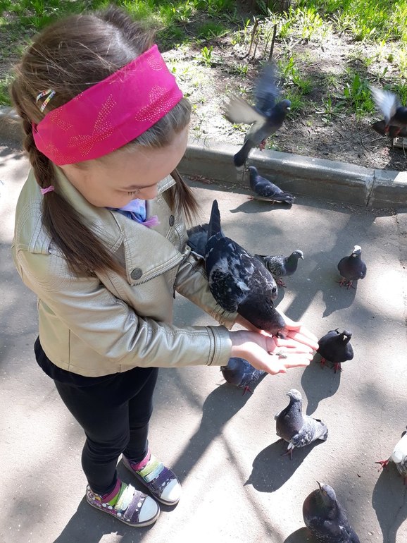 Ага, тут просто дело такое, дочь ждала у школы меня, я подошла и пока шла семки лузгала)) С дочей встретились я уронила семки чуток и тут такое началось)) Орава такая налетела, а дочке весело (счастливая))). Я такая ей говорю, давай с руки попробуем и тут сама удивились вообще без проблем садились на руки. Настя давай орать я тоже так хочу, ну и насыпала ей)))) Потом правда мне стало страшновато так как они подлетали очень близки и могли наверно клюнуть даже в глаз( Покормили чуток и ушли. А во дворе возле дома голуби оказались трусишками))) Разница какая....