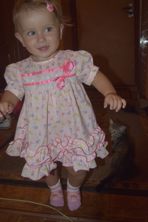 -когда хочет на ручки подходит к тебе и начинает на пальчики вставать:верх-вниз...