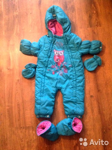 Потом, с апреля, был еще красивый, но немного дурацкий комбез полегче (этот розовый все же зимний). Вот такой, только тут девочка на картинке большущая, у нас-то был 68 размер: