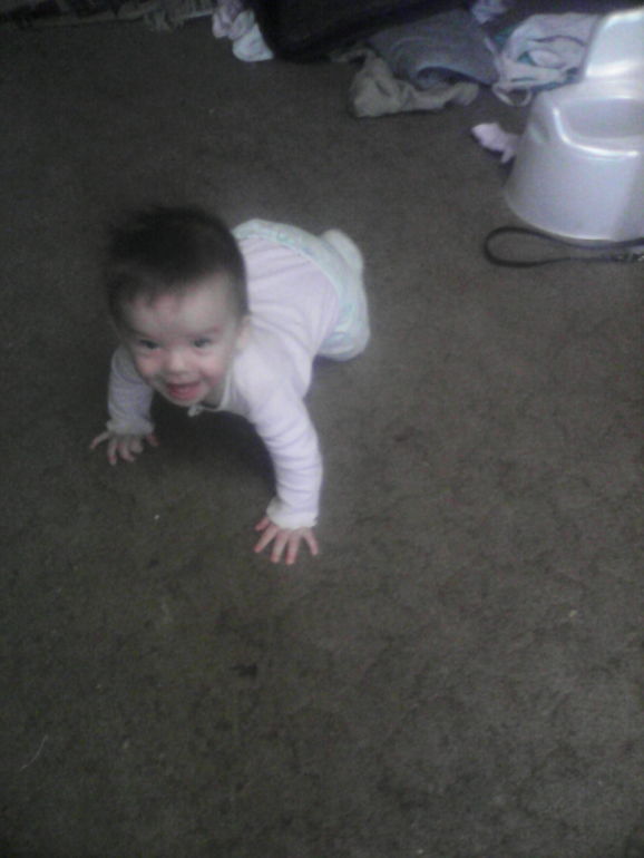 Начинаем ползать на четвереньках, но когда спешит падает на пузо и ползет как червяк))))