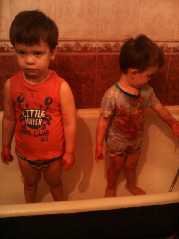 Боже дай мне сил))) Сегодня были пальчиковые краски, раскатала ватман по полу, благо сейчас ковра нет, одела одежду которую не жалко. Дала краски проследила, сидят малюют руками по ватману. Пошла доваривать суп, режу картошку тишина, даже не дерутся, мне уже стало страшно. Зашла в комнату, блин, они даже волосы себе покрасили в красный цвет. Девочки подскажите игры для развития мелкой моторики. Сейчас начала наблюдать за Даником, у него реально ручки неуклюжие. Вообще дальше фото художников. До моего ухода