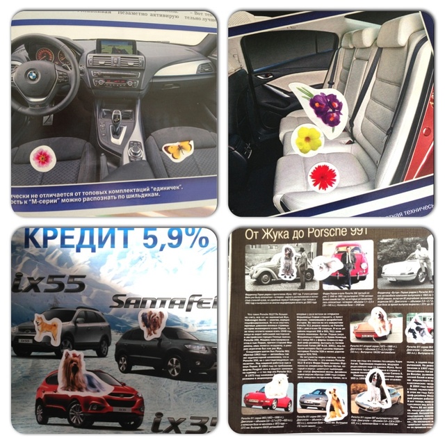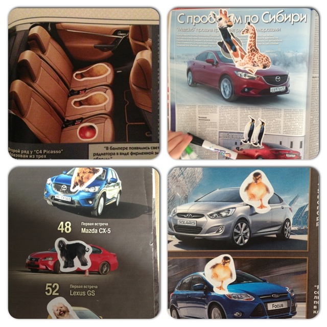 Это вообще наша страсть. Вернее - 2 страсти сошлись. Ди с года обожает листать папины журналы. А в год и 4, в самолете пока летели - некуда было клеить наклейки. Только журнал был- так и родилось. Сначала фары делали из цветов А рассаживать по машинам- это она сама придумала.