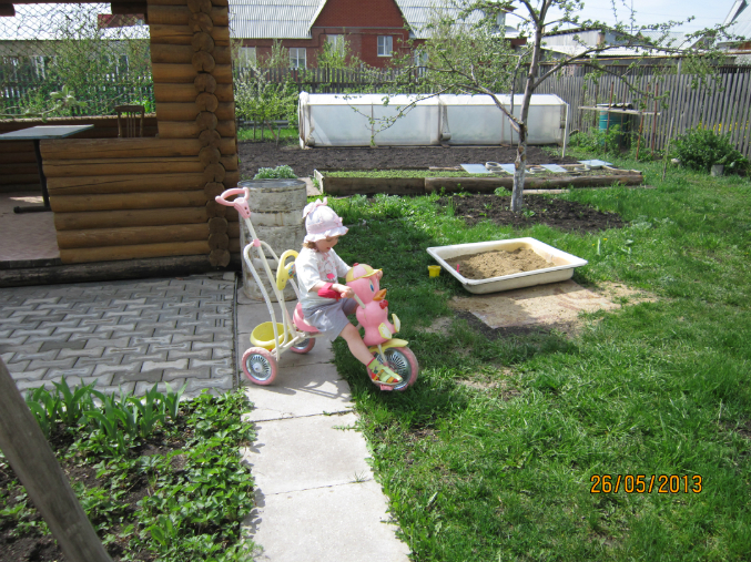 А Ритуся научилась крутить педали на велике. Теперь рассекает по двору.))