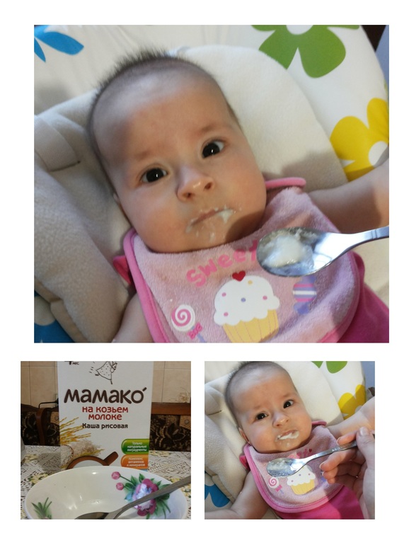Наши замеры в 4 месяца.Рост 64 см(+2 за месяц и 15 от рождения).А вот вес мы совсем плохо набираем 6000 кг(+ 500 за месяц и 3100 от рождения).В связи с этим врач нам посоветовала давать еще смесь,но доча наотрез отказалась от смеси.Причем пробовали мы разные смеси и не одну она не взяла.Поэтому врачом было решено ввести нам прикорм - кашу.Прошу тапками в меня не кидать.Я и сама понимаю,что еще рановато и с удовольствием кормила бы только грудью без прикорма месяцев до 6,но так уж сложилось.Сегодня мы первый раз ели кашку.Начали мы с рисовой каши на козьем молочке.Пока я дала доче 1 столовую ложечку.Лерке очень понравилось и она с удовольствием все съела