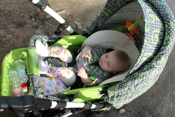 Приехали домой, открываем коляску(спала около гаража и по дороге домой), а Варюха подглядывает