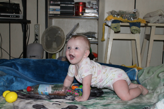 Сегодня Варюха уверенно встает на коленки и качается взад перед, стоит так долго потом плюхается на пузю.