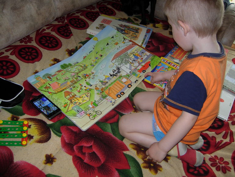 Это он, младший , процессе фотосъемки, еле книги собрала в кучку. И то забыла новинку для старшего , гляделку для младшего - Ябеда Корябеда :) На каждой странице ищет Мурзилку. И говорит - "Это я - Мурзилка"