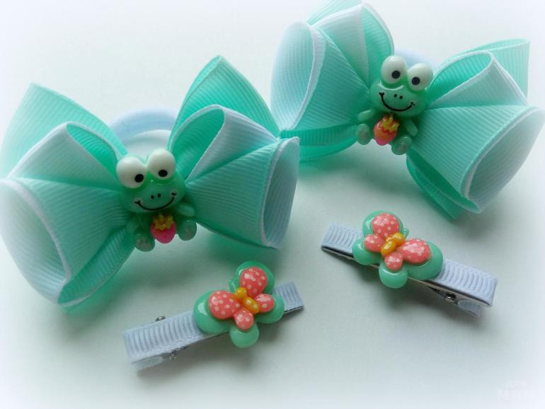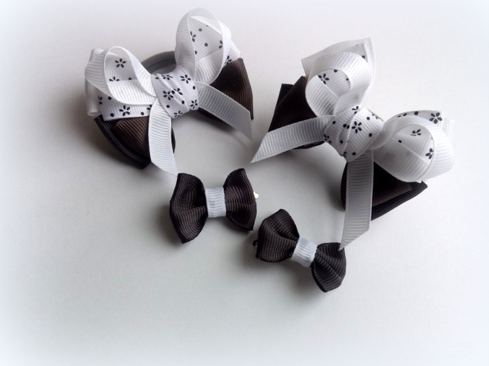 В наборе две пары больший и маленьких бантиков, а также малышка-заколочка.