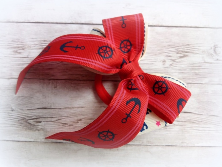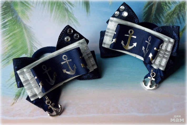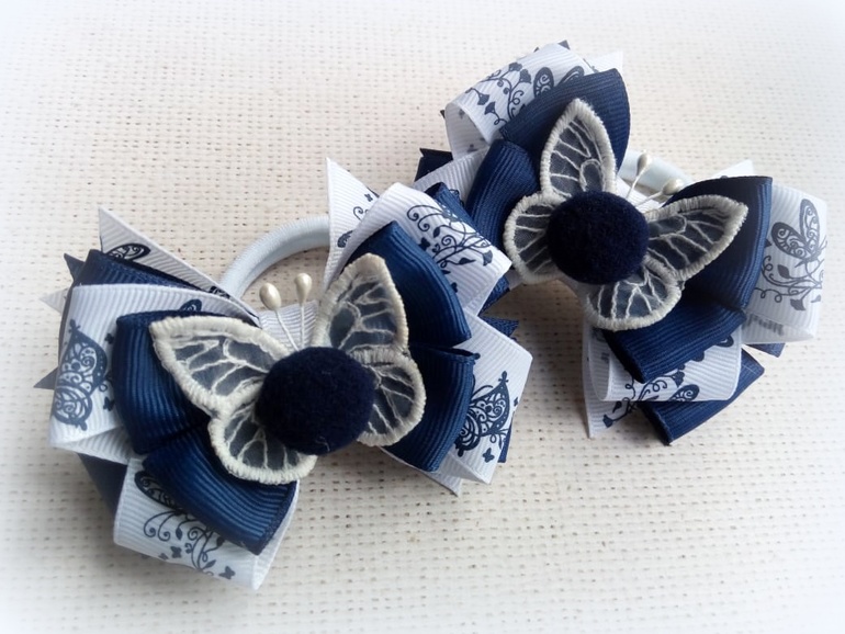 1) Школьные бантики на дизайнерской ленте. Смотрится нарядно за счет контраста. Размер по крайним точкам - 9 см. На праздники - очень свежий не избитый вариант!
