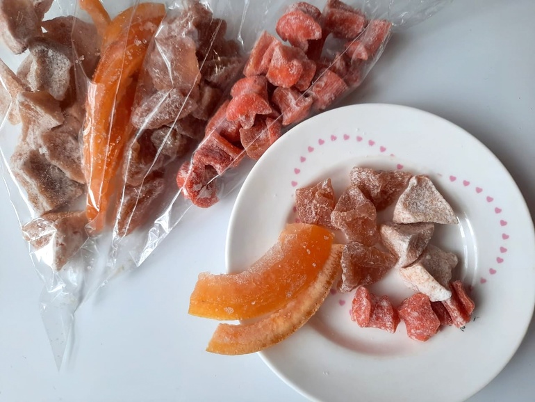 Это цукаты. О! Мой! Бог! Это что-то фантастическое!! Невероятный вкус, который покорил каждого в нашей семье. Мы не догадались из чего это. Потом когда допросили Любу, сказали :"Блииин, точно"! Консистенция ровная, нежная, аромат тонкий, сладость оптимальная. Она есть, но и не забивает естественную. Это просто невероятно!!! Вкусно до безумия!