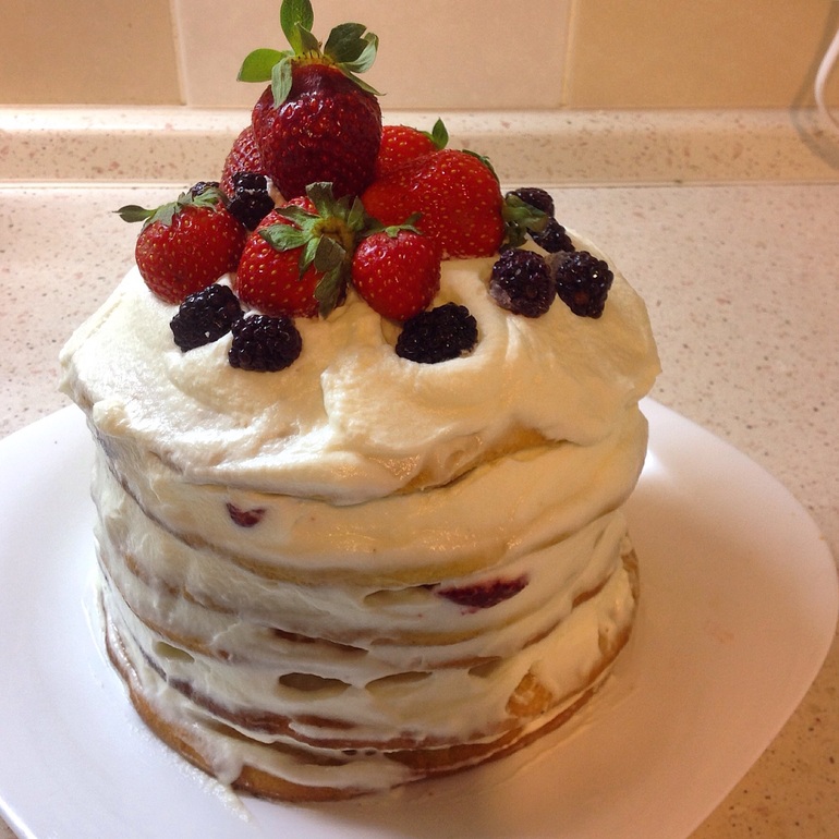 Готовится легко. Коржи тонкие, воздушные. Прослойка взбитые сливки. Украшение и начинка свежие ягоды клубники и ежевика.