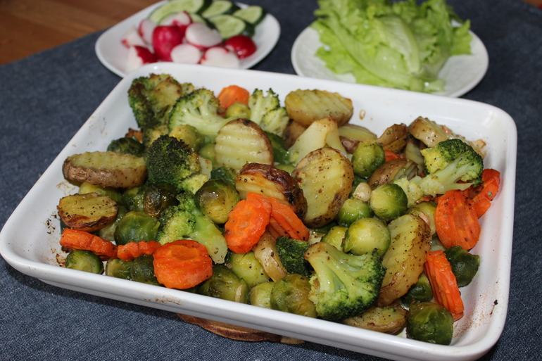 Картофель и морковь я отварила в СВЧ в течение 7-ми минут. Остудила и нарезала на ломтики. Капусту разморозила и промыла. Чеснок нарезала пластинками. Все сложила в миску, добавила соль, перец и масло. И оставила мариноваться на 30 мин. Далее все выкладываем в форму для духовки и на 40 минут при температуре 180 градусов. Пару раз во время готовки перемешала.