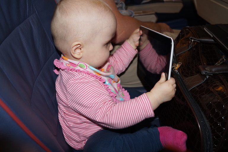 Сон ее был беспокойный,так как все время что то объявляли бортпроводники,кричали дети и вообще было как то шумно...но час она все таки поспала...после сна включился ее шилопопик и начались скачки на мне,на муже..бег и ползание по проходу...в общем было весело всем- Алисе,пассажирам,умиляющихся с нее,но только не мне с мужем,поочередно менявшие друг друга в забеге с дочерью...но это все мелочи...Рядом с нами в среднем ряду тоже летела пара с девочкой.По размерам девчушка была поменьше нашей,но видно что старше(как потом оказалось ей 1,6),так как сама хорошо ходила и неплохо орудовала вилкой.Вот с ней Алиса периодически оставляла свои гонки, и они о чем то между собой переговаривалась.Еще сзади нас летел мальчик лет 3-4,но по интеллекту ближе к Алиске))они с ним переглядывались в щели между креслами,пищали,скакали и дергали друг друга за руки...