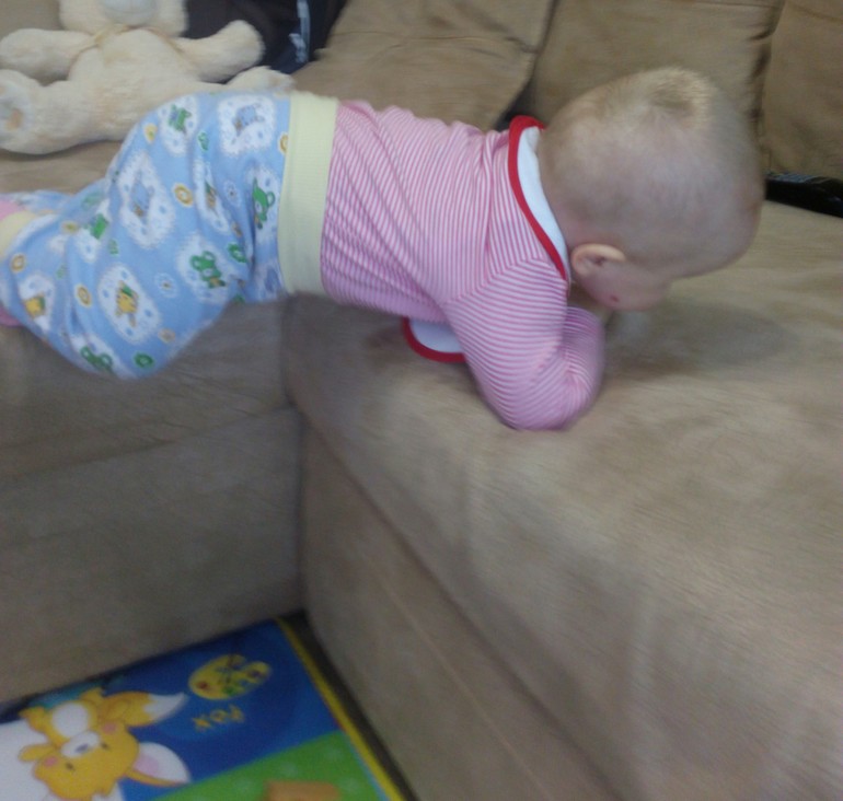 у нас дома высокая кровать и диван и Алиска не могла на них залазить и слазить...еще до отпуска я ее учила,но высота приличная...в отпуске,в первый же день она сама залезла и слезла с дивана,ура,значит может...а по приезду домой стала и на наш диван и на кровать залазить и слазить...так смешно это делает...ногу выпрямляет ровно,как на растяжку.закидывает и подтягивается)))пыхтит, но залазиет....