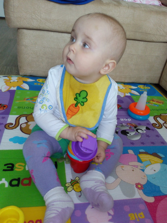 Алиса по прежнему танцор-диско))))пляшет под любую звонкую мелодию)))также стоя,сидя,лёжа)))в пляс уже пошли и ноги,раньше только попой крутила,руками и головой, а теперь вот и притопывает)))это мы часто начали потешку про козу дерезу читать...и там есть фраза "ножками топ-топ" вот она и выучила...