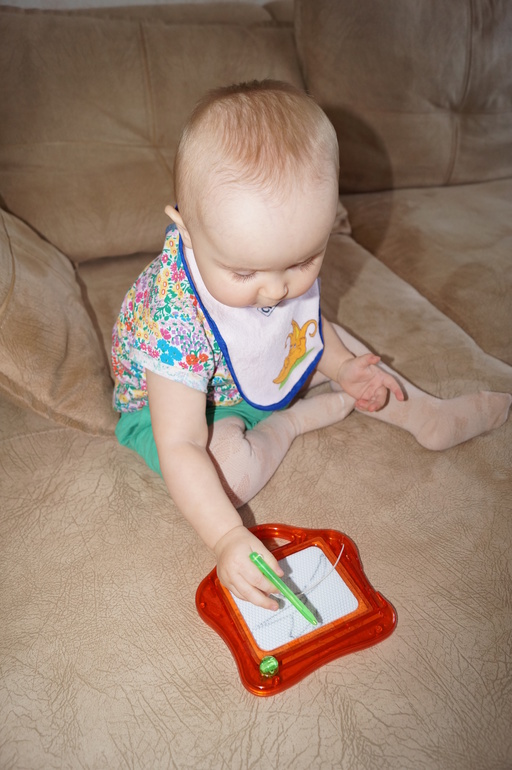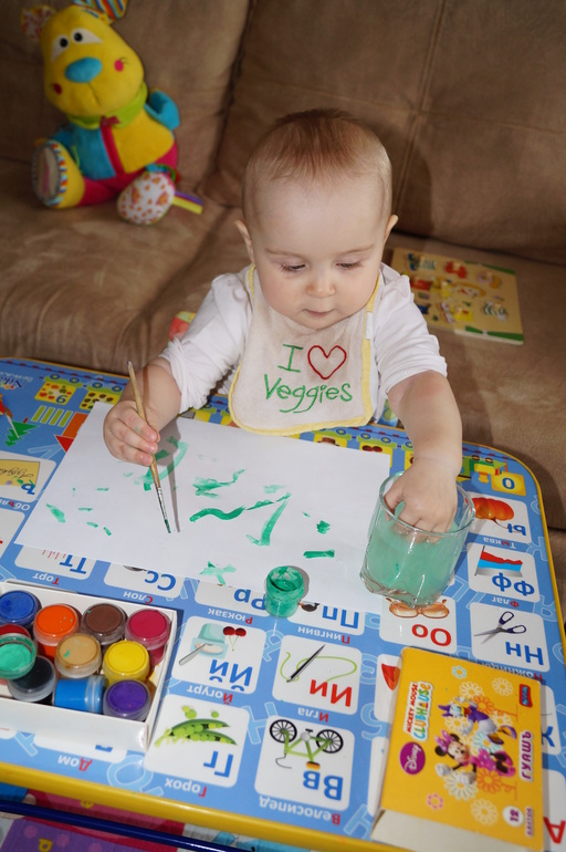В последнее время понравилось Алисе рисовать.Правда не сам процесс,а предметы творчества.Восковыми мелками рисует по бумаге,потому как я говорю ей это..была б ее воля,она бы эти мелки уже бы съела..как минимум погрызла...тоже самое с красками..намочит кисточку в воде,затем в краску и ..в рот...и правильно, зачем лист марать)))а вот если не дай бог вымажет руки,а она их всегда вымазывает,то начинается истерика без предупреждения(((скорее идем мыть..по этой причине пальчиковые краски и рисование мы пока исключили.