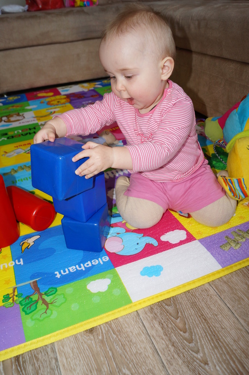 С интересом строит кубики, собирает крупный конструктор,научилась собирать собачку из лего дупло)))Вообще у нее такое интересное отношение к набору лего дупло с животными...Когда я высыпаю конструктор из коробки, то она закрывает глазки,склоняется над ним и стонет,как будто плачет...секундное дело...и все начинает играться..не знаю,что это означает,но так мило)))Сначала ей очень трудно было соединять детальки,теперь некоторые очень хорошо получаются, причем,если попросишь дать деталь на зайчика или собаку,то даст нужную.Собранных зверьков любит обнимать и качать)))приколюшка маленькая)))Пирамидку собирает.но без последовательности,пару раз соберет и раскидывает.Подолгу играет с куклами,укладывает их спать,катает на коляске.