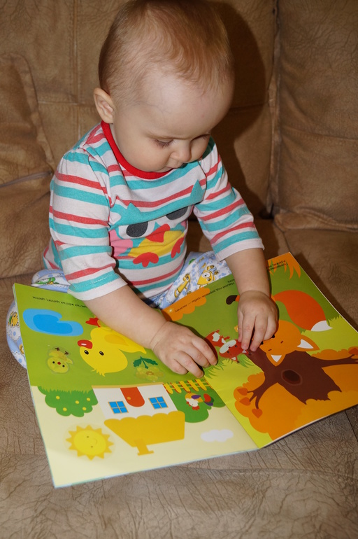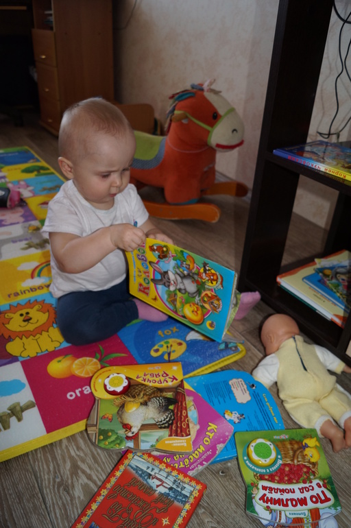 Особый интерес Алиска проявляет к книгам.Есть любимые.Очень любит их рассматривать,а вот читать не дает...редкий случай когда будет слушать.Но я все равно читаю часто в слух даже если она занята игрой,иногда подходит и смотрит картинки.Книг много,много музыкальных.2 книжки самые любимые - маленькая с глазками "Коза дереза" и книжка "Колобок" с русскими народными сказками. В ней такие сказки как колобок, репка,курочка ряба,теремок...но по факту целиком уже не одной сказки нет, страницы порваны-перепорваны...но она всегда из стопки других книг вытащит ее и принесет "читать".