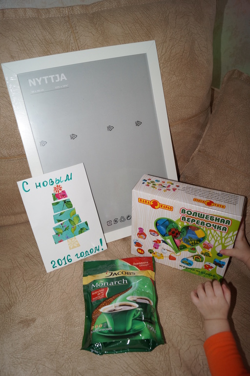 Настёна,спасибо большое за подарки!Ты настоящая сказочная Снегурочка,умеешь читать мысли)))Нам все очень понравилось,давно собиралась купить Алисе игру,чтоб бусины нанизывать,причем только утром подумала,надо все же на днях купить,а тут открываем посылку,а там такая игра!!!Чудеса!!!Алиса просто в восторге!Рамка очень понравилась,у нас нет в городе икеи,и я рада вдвойне,что у нас такая появилась,люблю такой стиль.В срочном порядке сделаем Алискино фото такого размера и повесим к нашим рамкам!!!А открытку от Снегурочки сохраню и покажу Алисе когда порастет!