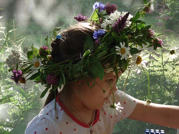 Но в промежутках между дождями ходили на поле за цветами. Венок сплели из ромашек, клевера, вплели крапиву, полынь, зверобой, тысячелистник.