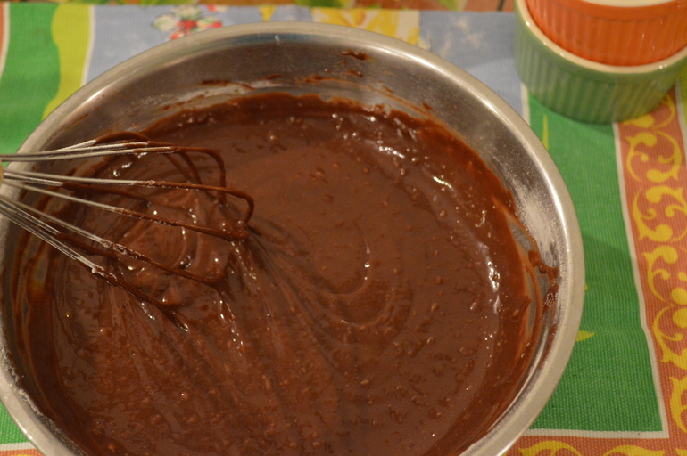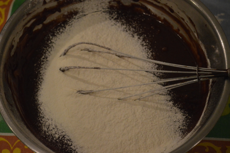 5. Взбитые яйца с сахаром вливаем в остывшую смесь шоколада и масла, перемешиваем венчиком. Потом постепенно добавляем просеянную муку.